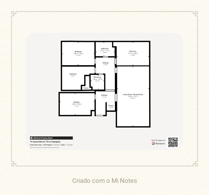 A sala está presentemente ampla pelo facto de se ter anulado uma das paredes que pertencia a um dos quartos. Tendo neste momento apenas 3.
